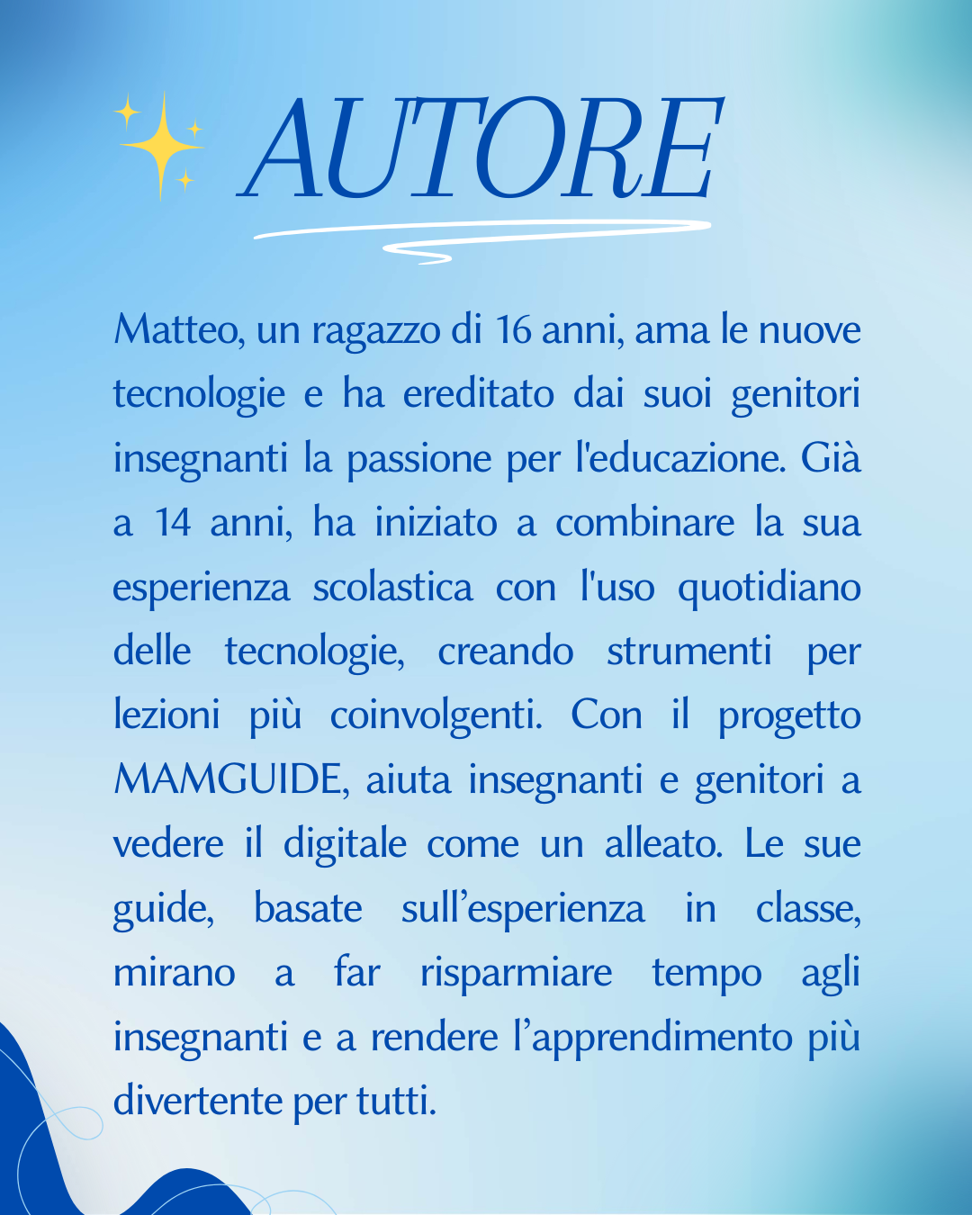 Matteo (Autore) è un ragazzo di 16 anni, appassionato di nuove tecnologie e figlio di insegnanti, da cui ha ereditato l’amore per la scuola e l’educazione. Da quando ha 14 anni ha unito la sua esperienza a scuola e la pratica quotidiana delle sue maestre e dei suoi professori, con la passione per le tecnologie e per l'intelligenza artificiale, creando strumenti semplici e concreti per rendere le lezioni più coinvolgenti. Con il progetto MAMGUIDE, aiuta ogni giorno insegnanti e genitori a scoprire come usare il digitale non come ostacolo, ma come alleato. Le sue guide nascono dalla sua esperienza a scuola e dall'ascolto diretto delle esigenze delle classi e hanno un obiettivo chiaro: far risparmiare tempo agli insegnanti e rendere l’apprendimento più stimolante per bambini e ragazzi.